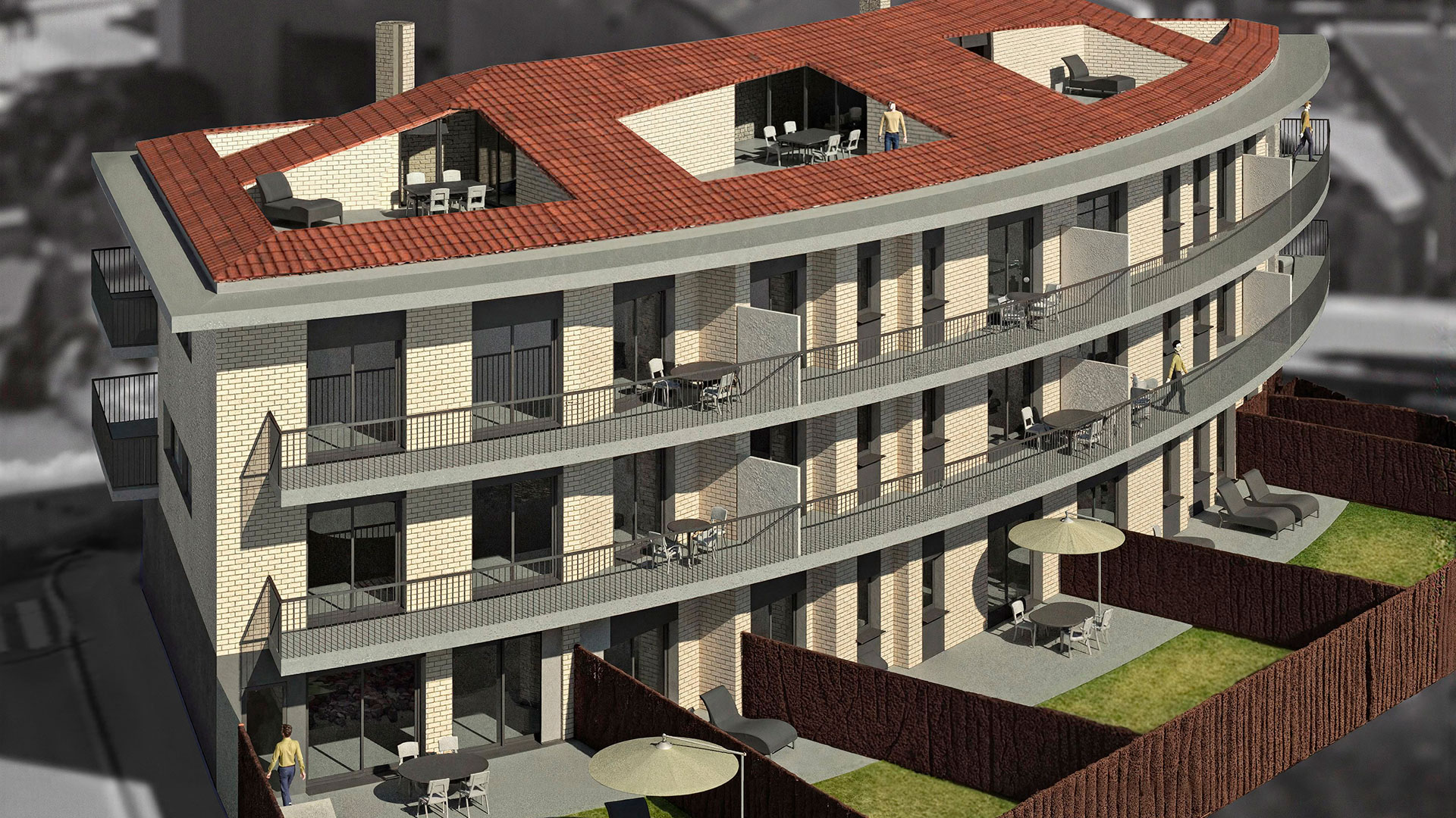 Les terrasses es pavimentaran amb peces de gres per a exteriors.